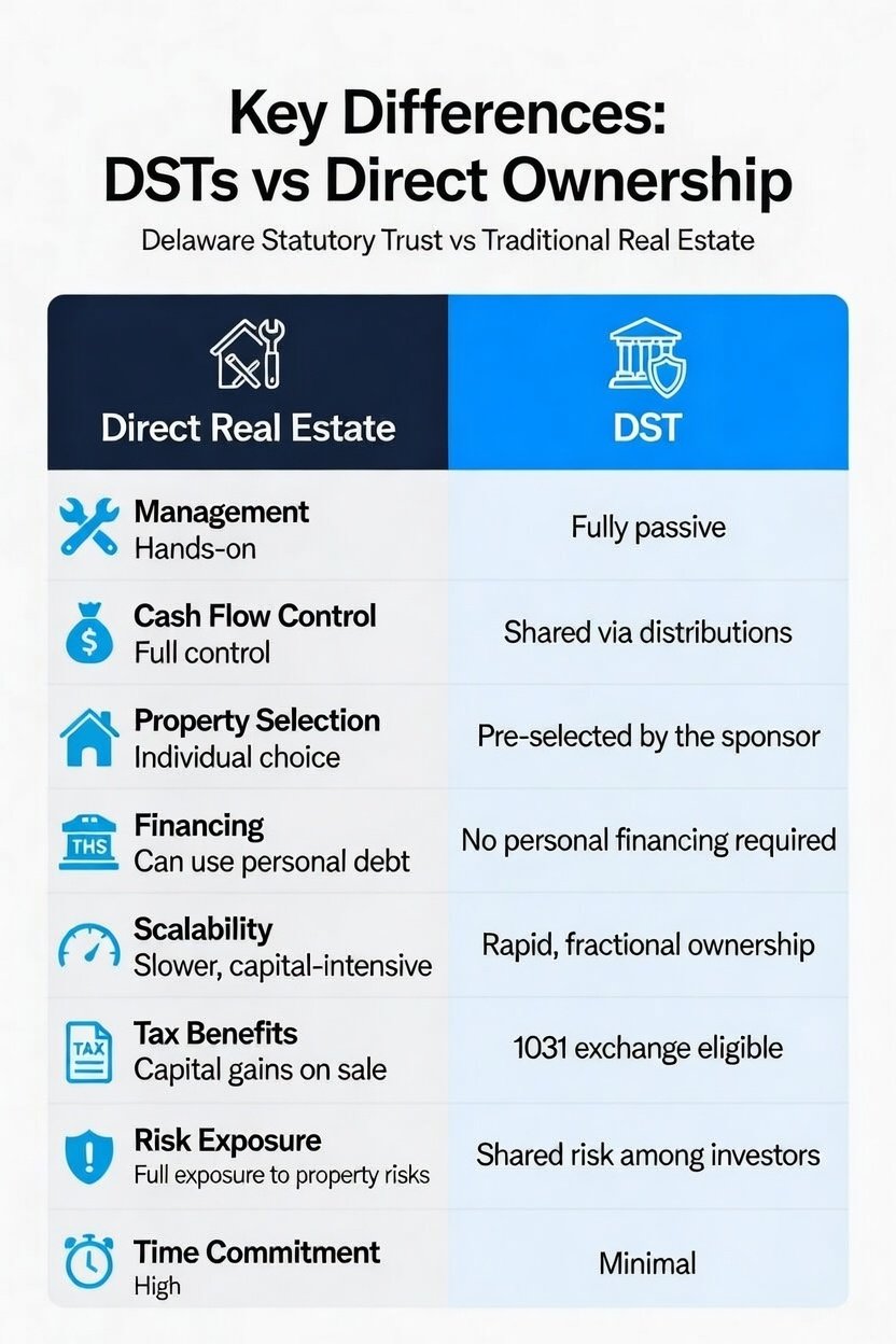 Enter Delaware Statutory Trusts. For elite investors, the choice between DSTs and direct ownership is not just about convenience. It is a strategic decision that affects taxes, cash flow, scalability, and long-term wealth. Here is the breakdown.