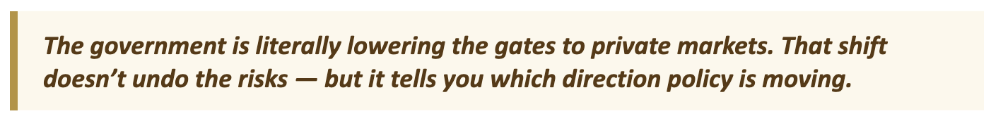 August 2025 Executive Order — Democratizing Access to Alternative Assets: President Trump signed an executive order directing the exploration of expanded access to alternative investments for 401(k) investors. While implementation details are still developing, the direction of policy is clear: the barriers between retail investors and private markets are being deliberately reduced.