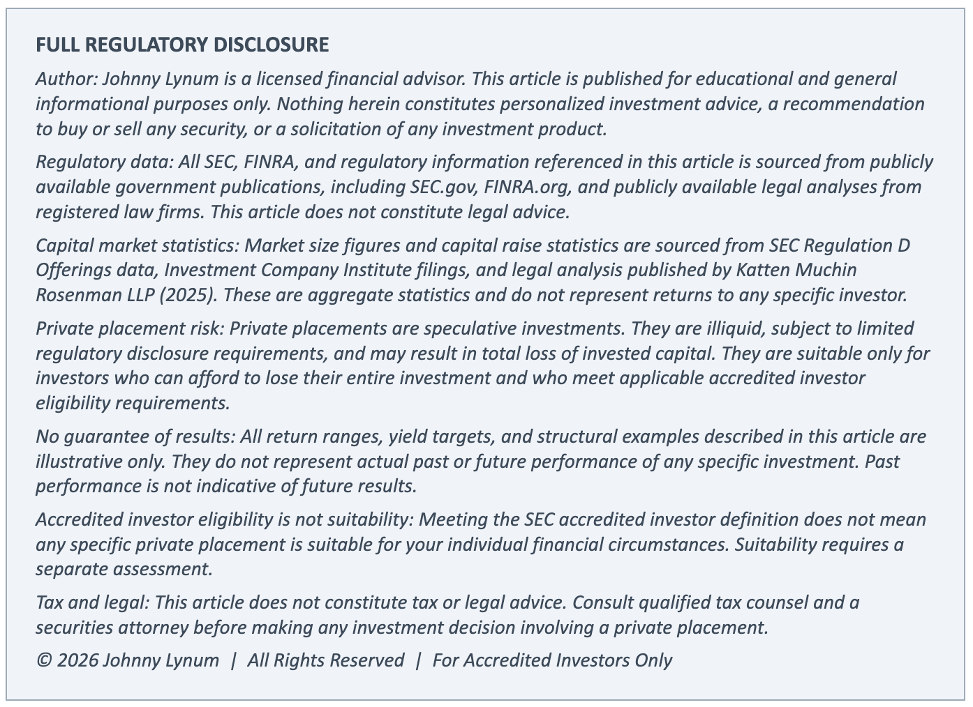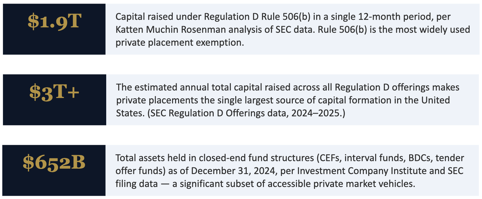 *Data disclosure: Capital market figures above are sourced from publicly available SEC data and third-party legal analysis (Katten Muchin Rosenman LLP, 2025). These are aggregate market statistics and do not represent returns to any specific investor. The private placement market is heterogeneous — individual deal outcomes vary widely.
