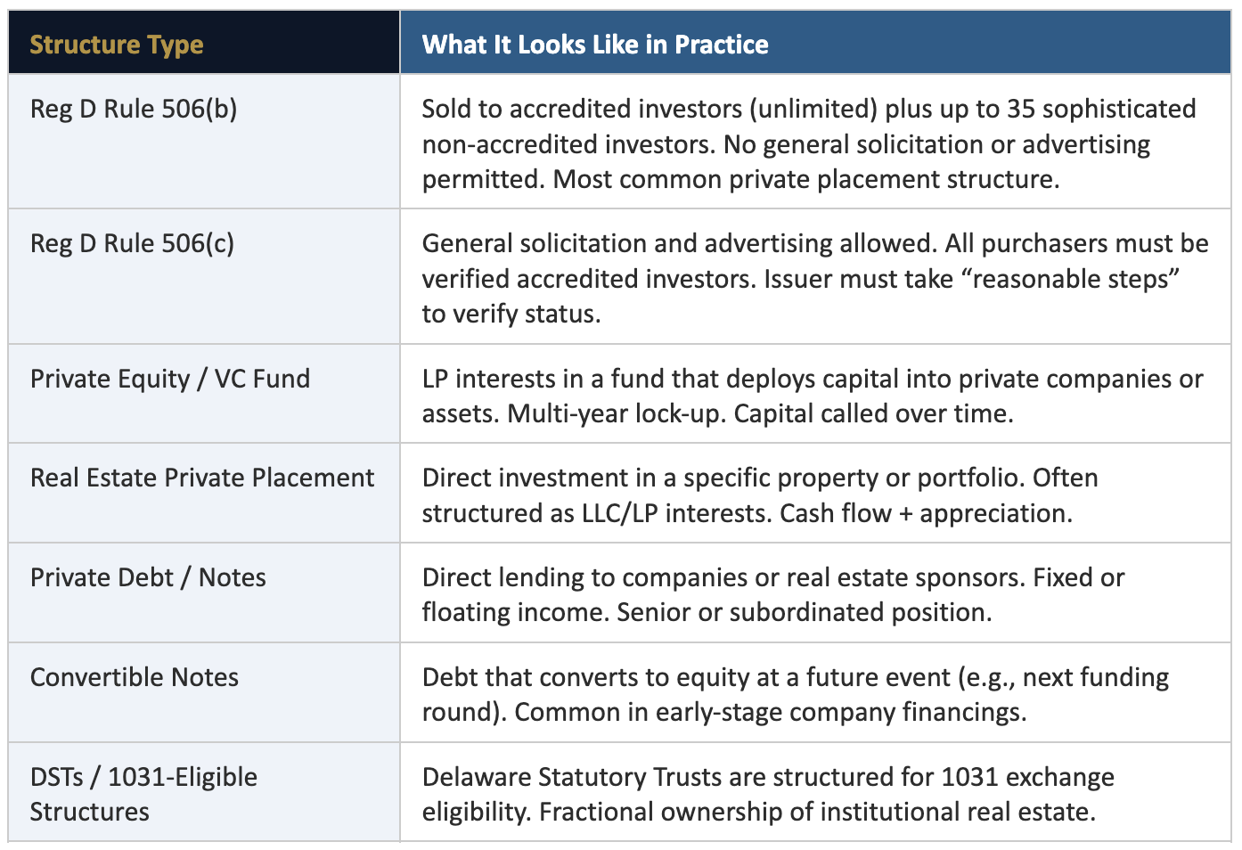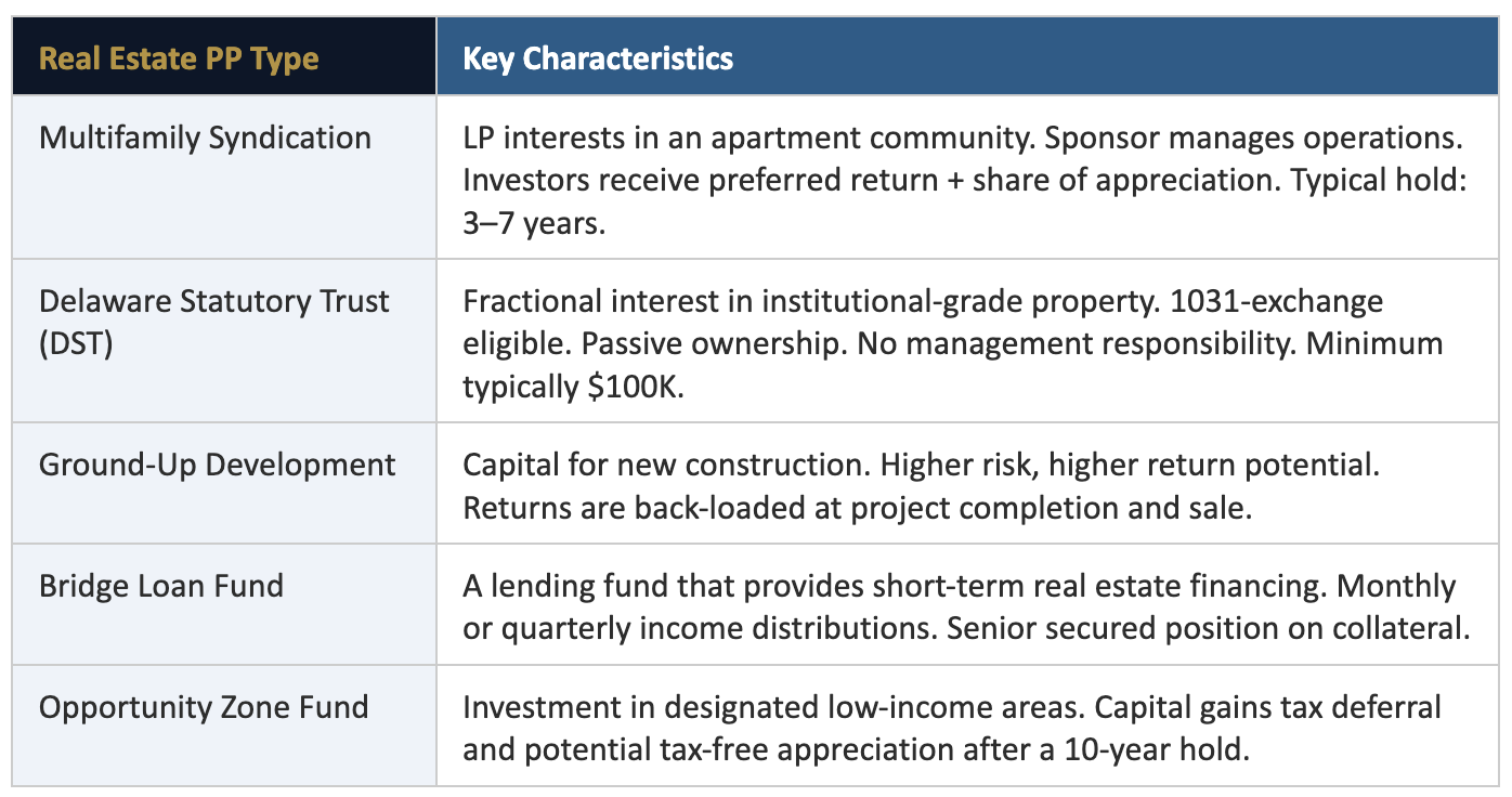 For most accredited investors entering private placements for the first time, real estate is the most familiar and accessible on-ramp. Here’s how the most common structures work:
