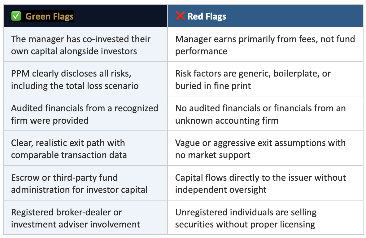 Step 1 — Read the PPM completely: The Private Placement Memorandum is the governing document. It contains the business plan, risk factors, use of proceeds, financial projections, management background, and legal terms. If you haven’t read it cover to cover, you haven’t evaluated the deal.