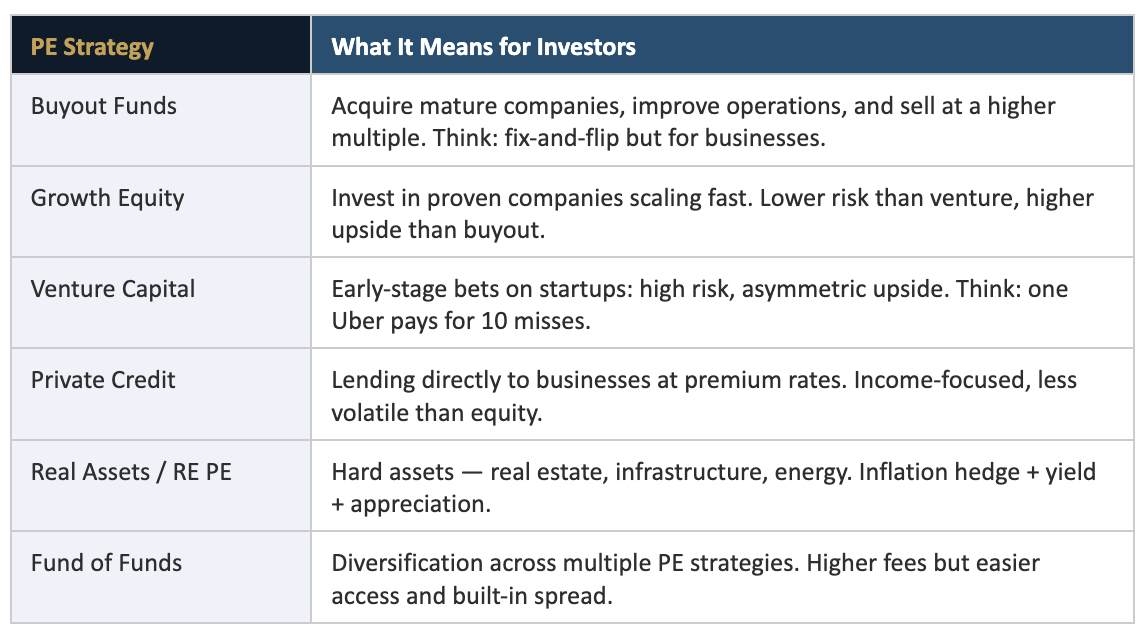 Each strategy carries different risk, return, and liquidity profiles. A sophisticated private equity allocation uses more than one.