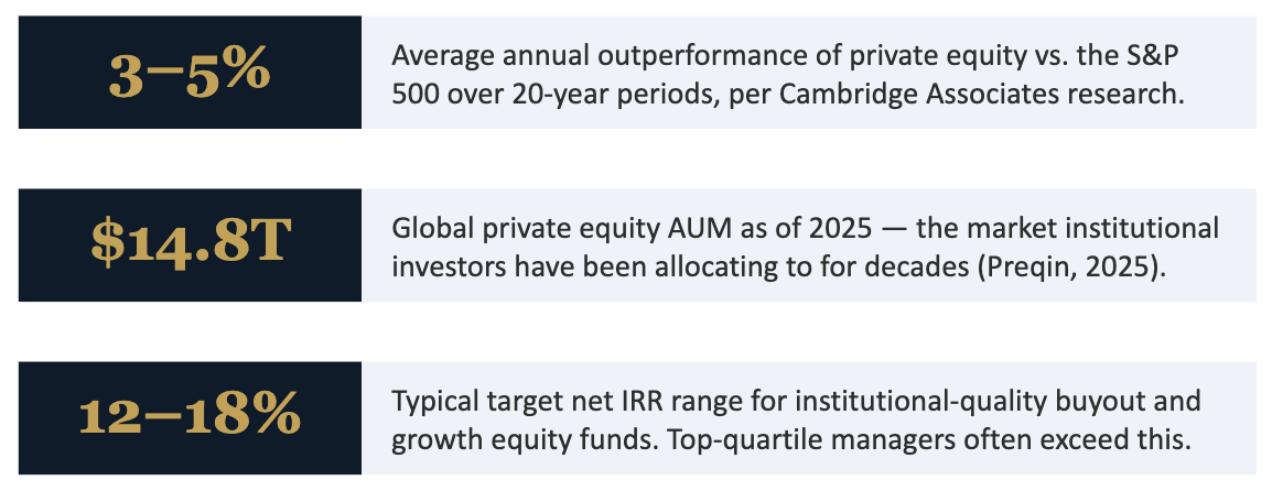 According to Cambridge Associates data, private equity has outperformed the S&P 500 by an average of 3 to 5 percentage points annually over rolling 10- and 20-year periods. That spread compounds dramatically over time.