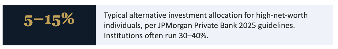 Diversify across strategies: A mix of private credit (income), real estate (inflation hedge + yield), and growth equity (appreciation) creates a more resilient alternative sleeve.