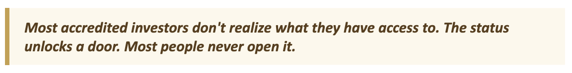 Then I got my accredited investor status and started paying attention to what was actually available, and what I found shifted how I thought about building long-term wealth entirely.