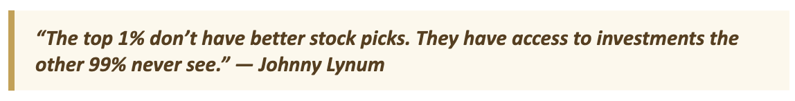 The institutions aren't putting 100% of their capital in public stocks. They're allocating meaningful chunks into private markets: private equity, private credit, real assets, venture. And for the first time in a meaningful way, accredited investors have access to the same table.